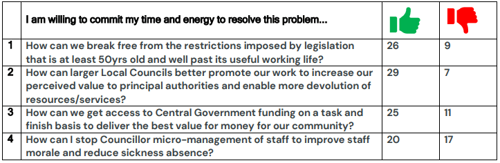 - We’ve chosen 4 problems to take forward! Colleagues who attended the workshop considered a long-list of 9 ‘problem statements’ and through group discussions they whittled the 9 down to a top 4 to be taken forward into the ‘Ideation’ and ‘Prototyping’ phases. The 4 top problems are: 1. How can we break free from the restrictions imposed by legislation that is at least 50yrs old and well past its useful working life?; 2. How can larger Local Councils better promote our work to increase our perceived value to principal authorities and enable more devolution of resources/services?; 3. How can we get access to Central Government funding on a task and finish basis to deliver the best value for money for our community?; 4. How can I stop Councillor micro-management of staff to improve staff morale and reduce sickness absence?