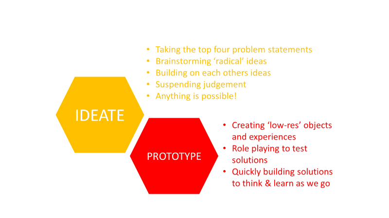 I reflected on the creative design thinking methodology from the Institute of Design and Stanford University that we were using to try to unlock the wicked problems in a new way, which you can read more about in my previous blogs here and here. We focussed in on the next stages – Ideation and Prototyping – which I hoped we’d be taking forward with support from colleagues in the Innovation hub at De Montford University in early 2023.